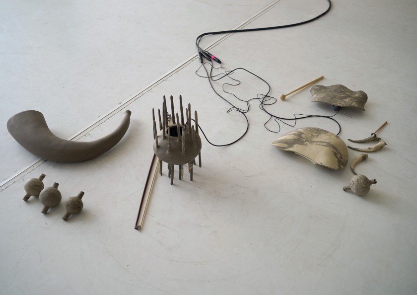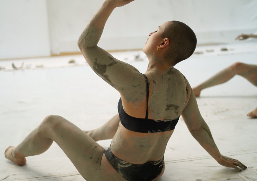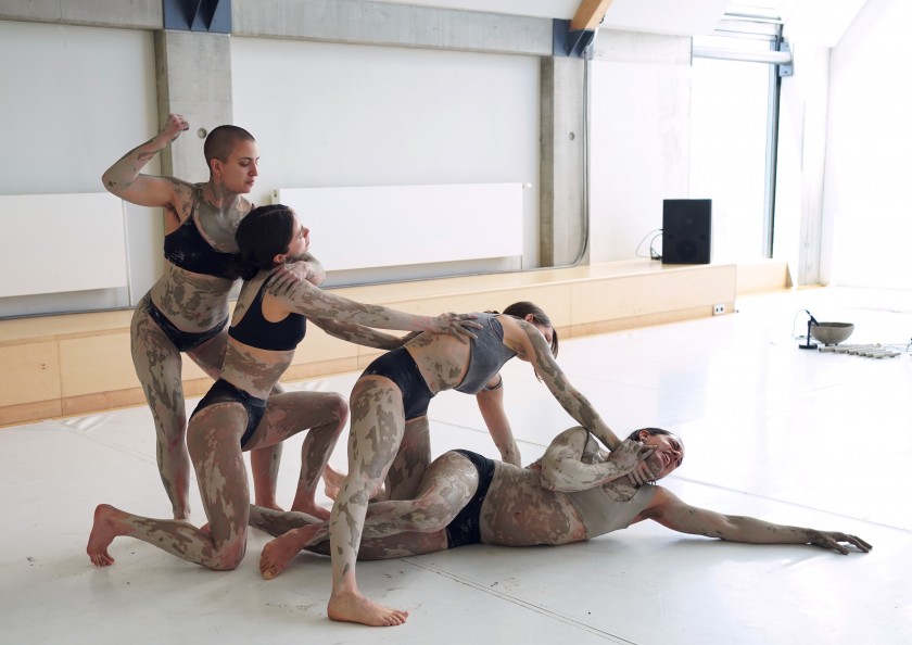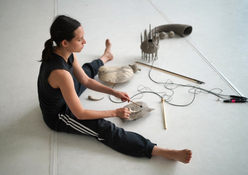 Currently in creation, with a premiere in fall 2026, in Clay Bodies, raw clay and fired ceramic are used to generate movement, sound, and music. Kneading, striking, wearing, breaking: gestures that produce a vibration too persistent to ignore. Voices shift and tune into the rumble of destruction. Drawing on gestures from art history, and popular culture, in the performance past and present collide.